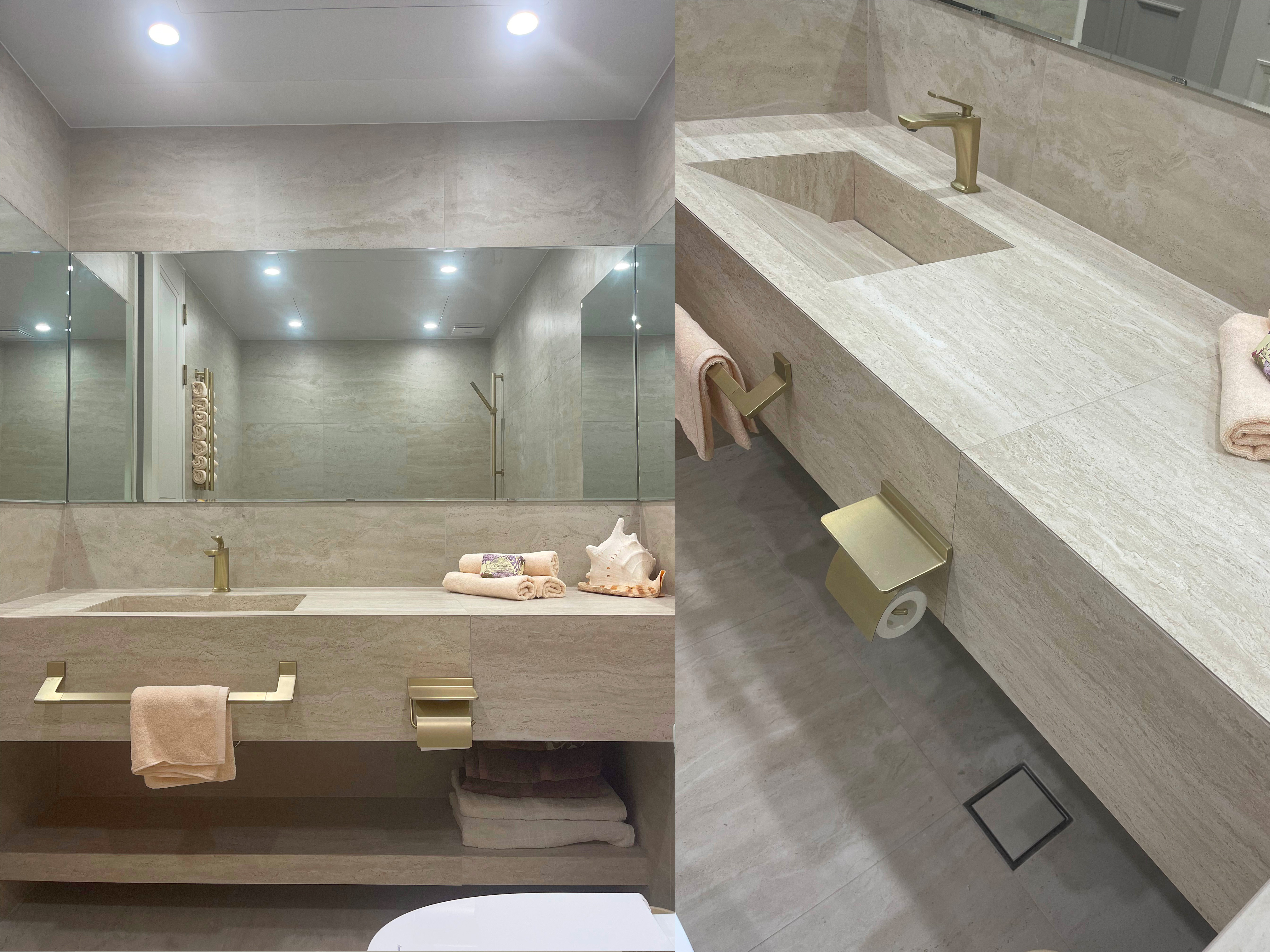 자재를 고를 때, 미리 본인이 하고자하는 인테리어의 컨셉을 정리해 놓은 것이 있다면 그것에 부합하는 디자인을 고르면 되지만 혼란스러울 때는 업체 사장님의 추천받기를 권합니다. 사장님들은 최근 트렌드부터 가격별로 대안 제품을 다아시고 계시기 때문입니다. 나는 인테리어 전 50장이 넘는 PPT를 준비했기 때문에 사장님은 검토하시고 컨셉에 맞는 제품을 권해주셨습니다. 살면서 인테리어를 여러 번 하기는 어렵기 때문에 이 번 기회에 생각했던 인테리어를 최대한 구현해 내자고 다짐했었기 때문에 비용이 늘어남에도 ‘조적세면대’를 선택했습니다. 1.8미터의 긴 세면대였기 때문에 자체 제작이 필요했고 좌에서 우로 최대한 타일 이음새가 안보이게 하는 게 관건이라서 1200x600 사이즈 트라버틴(대리석 문양) 타일로 결정하고 벽과 바닥 최대한 비슷한 타일로 선택했습니다. 과감하게 상부장은 없애고, 세면대 하부에도 하부장대신 오픈 선반형태로 제작을 했습니다. 거울은 앞태, 옆태, 뒷태를 쉽게 확인할 수 있게 3면으로 크게 붙였습니다.
